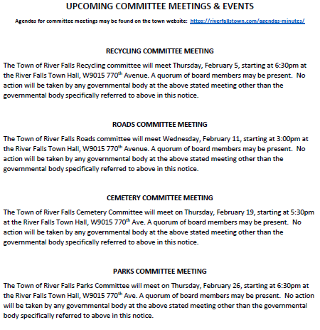 The Town of River Falls Recycling committee will meet Thursday, February 5, starting at 6:30pm at the River Falls Town Hall, W9015 770th Avenue. A quorum of board members may be present. No action will be taken by any governmental body at the above stated meeting other than the governmental body specifically referred to above in this notice.